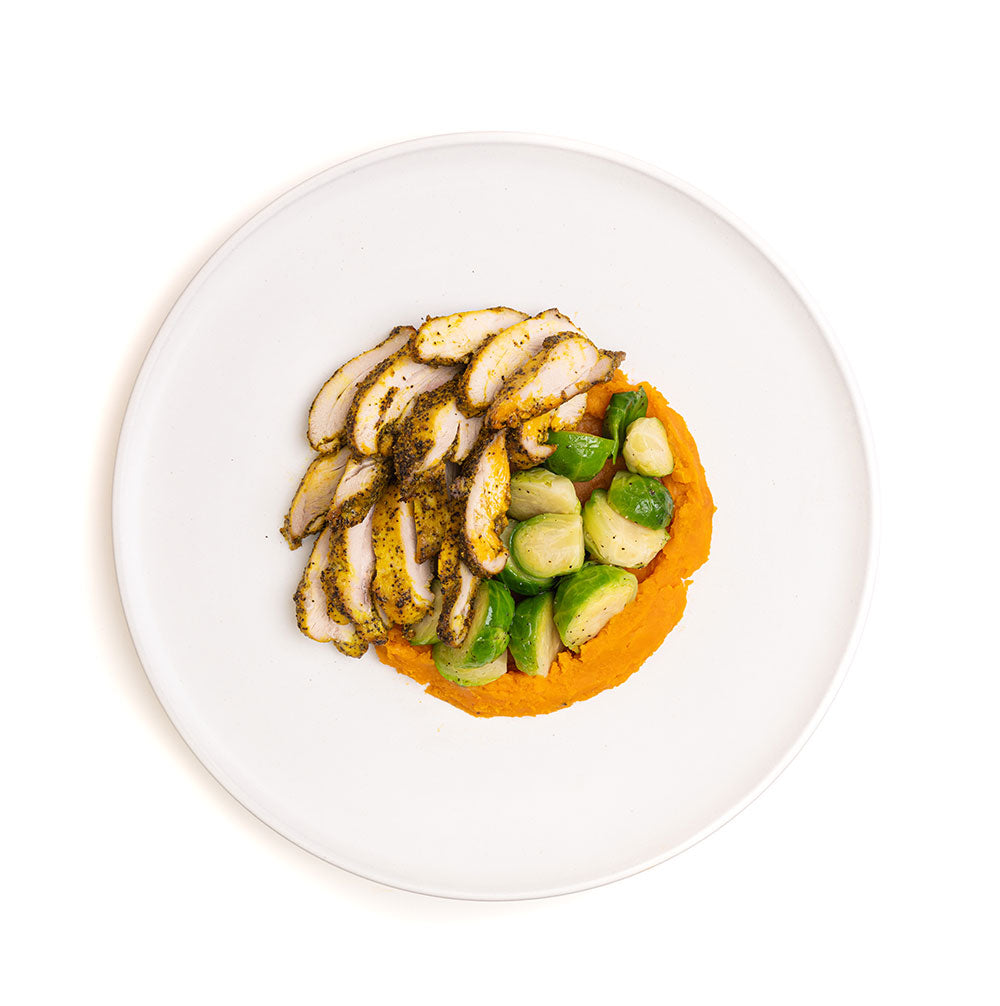 Cast Iron Chicken Thighs with Sweet Potato Mash & Brussels Sprouts