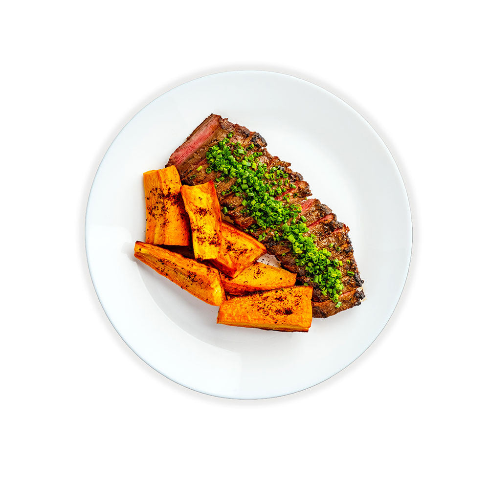 Miso Flat Iron Steak with Sweet Potato Fries & Zesty Chimichurri Sauce