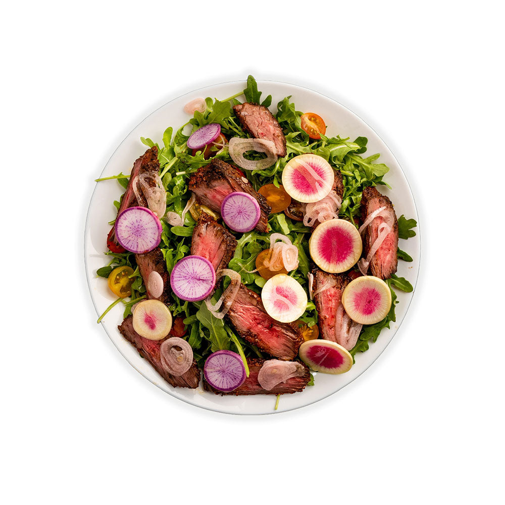 Peppered Steak & Wild Arugula Salad with Pickled Shallots & Radishes